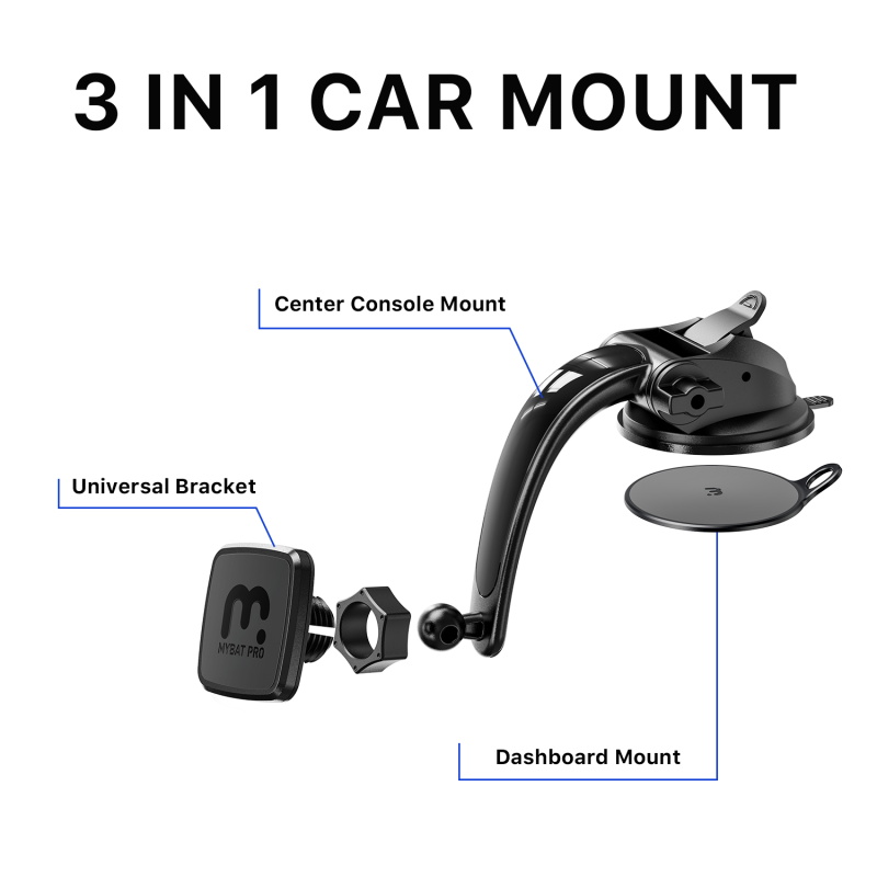 Provide your customers with hands-free convenience and keep their phone at the ideal glanceable level on their car's center console with the Universal Center Console Magnetic Mount from MyBat Pro. It is available in attractive packaging that makes it stand out on the shelf and shows off the product beautifully, making it an ideal addition to your inventory. The MyBat Pro Universal Center Console Magnetic Mount uses a sticky gel pad suction cup for a quick and easy installation and a press-down locking lever for the most stable and secure mounting experience. The adjustable arm and swiveling ball allow customers to switch between portrait and landscape viewing options. Whether it's mounted on the dashboard or center console, customers will have an uninterrupted driving experience! By sticking the included metal plates to their phone or case, customers can magnetically lock their device in place! The phenomenal magnetic force keeps your customer's phone safe and within reach even on bumpy and rocky roads! Customers can use the included adhesive dashboard stability pad to provide additional support on uneven surfaces. MyBat Pro offers an extended lifetime warranty for the Magnetic Lock-Grip Center Console Mount, ensuring the best quality, performance, and customer satisfaction. Features: Hands-Free Mounting Works on Center Console & Dashboard Universal Phone Compatibility One-Handed Operation Safe & Secure Magnetic Alignment Quick Installation & Removal Sticky Gel Pad Suction Cup Locking Lever Adhesive Dashboard Stability Pad 135° Adjustable Arm 360° Swivel Ball Rotation Portrait or Landscape Viewing Includes 2 Adhesive Metal Plates Lifetime Warranty Includes: Magnetic Head Center Console Mount 3M Adhesive Dashboard Stability Pad 1 Square Adhesive Metal Plate 1 Round Adhesive Metal Plate