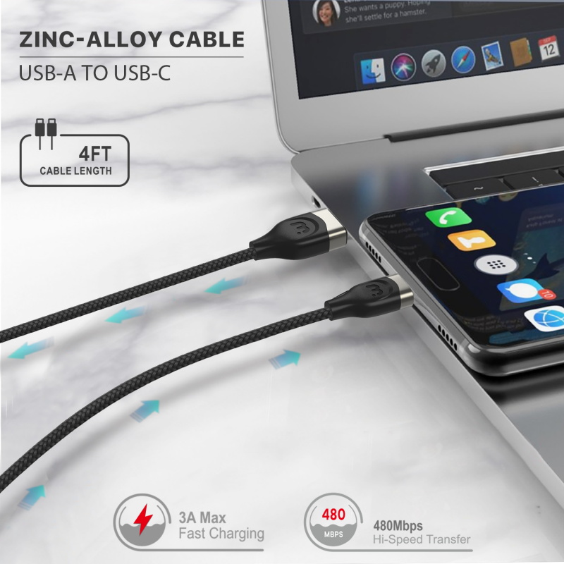 MyBat Pro USB-A to USB-C Zinc Alloy Quick Charging Cable - 4 FT – Black