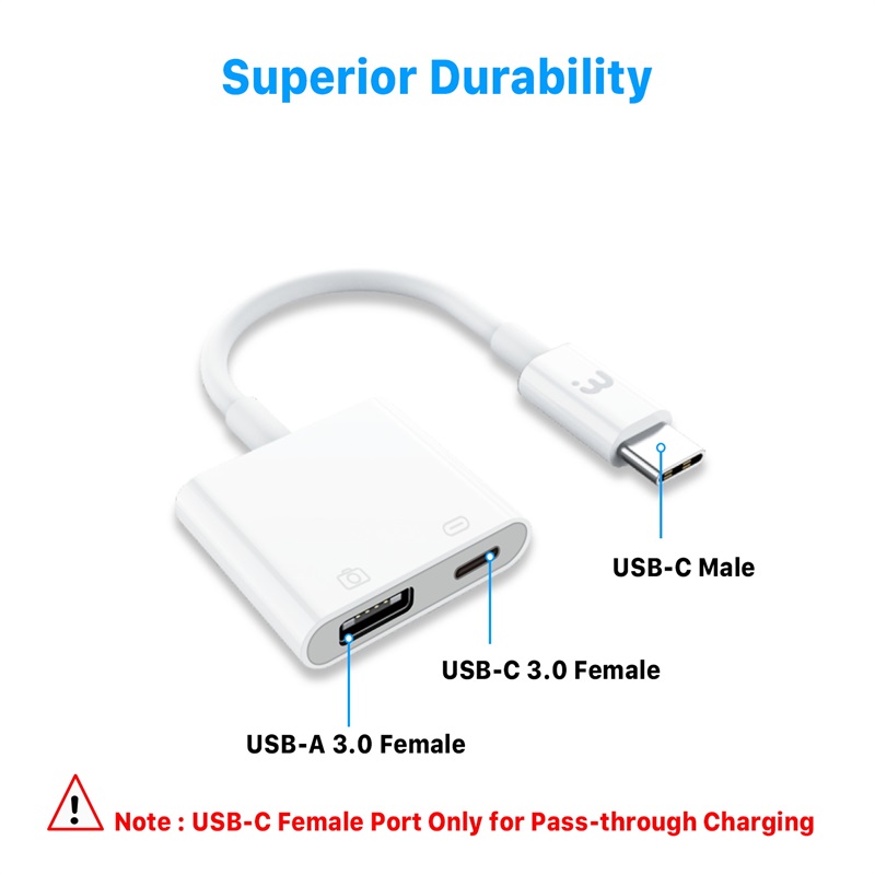 Specification:Color: WhiteLength: 13cmCharacteristic: Charging + OTGMaterial: ABS+TPEImportant Note Before Purchase:1. Please make sure your mobile phone or tablet supports OTG function, and for certain mobile phones, please go to phone’s setting menu and enable ’OTG function’.2. The transmission rate is subjected to the limits of SD card, external hard drive and flash drive.3. Some model of devices do not support charging and using data at the same time, if you are not ensure, please contact with us. Pleas Note:1. Make sure your device support OTG function before use2. Make sure your device support PD quick charge then it can be support data and power simultaneously 3. Please Note: unable to support hard driver.4. Some devices may not support charge and using OTG Data at the same time, if you are not ensure, please contact with us before your purchase.