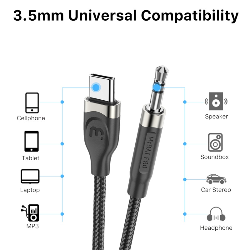 Using the USB-C to 3.5mm Male Audio Connector, your customers can stream high-definition audio from their Android phone or tablet to non-Bluetooth devices. It is available in attractive packaging that makes it stand out on the shelf and shows off the product beautifully, making it an ideal addition to your inventory. Customers can connect the 3.5mm Audio Cable to any device with a USB-C port to listen to audio on their favorite media playing devices or portable speakers, wired headphones, headsets, and even connect to older cars and home stereos! Your customers will only hear the purest sound possible with a built-in digital analog converter. At the perfect extended length of 4ft/1.2m, the cable won't tangle or cause excess length issues trying to plug in or reach devices, and it is highly durable due to its reinforced relief collar and flexible protective cover for an outstanding bend lifetime. MyBat Pro offers a lifetime warranty for the USB-C to 3.5mm Male Audio Connector, ensuring the best quality, performance, and customer satisfaction. Features: Made for USB-C Devices USB-C Connector 3.5mm Male Audio Connector Works With All 3.5mm Jacks or Auxilary Ports High-Definition Playback Built-In Digital Analog Converter Seamless Plug & Play Braided Nylon Construction Beveled Step-Down Design Unrivaled Durability Incredible Bend Lifetime Extended Length Lifetime Warranty