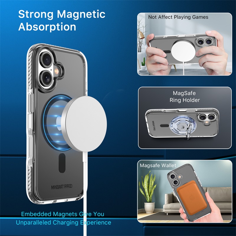 Vivid Series MagSafe Case for iPhone 16 amplifies clarity and vibrance and all around protection. This crystal-clear case, adorned with meticulously designed black textured non-slip bumpers, seamlessly combines style with practicality. The +AttachMe ring in silver facilitates rapid attachment to MagSafe chargers and mounts, ensuring effortless functionality. Certified military-grade protection envelops your customer’s iPhone 16, guarding it against scratches, bumps, and drops while allowing its vivid allure to shine through. Elevate your product offering with the Vivid Series MagSafe Case, where protection meets sheer elegance. MyBat Pro proudly supports the Vivid Series MagSafe Case with a limited lifetime warranty, underscoring our commitment to the highest quality, performance, and customer satisfaction. Features: MagSafe Compatible +AttachMe Magnetic Ring Alignment Military-Grade Drop Protection Shock & Impact Resistant Raised Bezel Edges & Camera Ring Crystal-Clear Design Textured Non-Slip Bumpers Easy Access: Ports & Buttons Quick Installation & Removal Lifetime Warranty