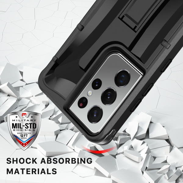 Offer your customers the highest-ranked protector for their Samsung Galaxy S21 Ultra with the Warrior Series Case from MyBat Pro! It is available in attractive packaging that makes it stand out on the shelf and shows off the product beautifully, making it an ideal addition to your inventory. The Warrior Series Case gives your customers Galaxy S21 Ultra the fiercest line of defense against drops, falls, and scratches! This dual-layer, certified military-grade case features a rugged black polycarbonate outer shell and padded TPU interior shell, providing up to 2X the protection and durability of standard cases. The Warrior Series Case features shock-absorbing corners, raised bezel edges, and texturized ridges to ensure additional safety while compact for easy access to all buttons and ports. Using the 360° rotating holster clip, customers can clip the case to their pockets and go anywhere, or they can set down their Galaxy S21 Ultra and use the integrated kickstand for hands-free viewing. Customers will also experience diamond-level coverage with the included high-grade tempered glass screen protector, boasting a 9H hardness keeping their Galaxy S21 Ultra screen safe and pristine! MyBat Pro offers an extended lifetime warranty for the Warrior Series Case For Galaxy S21 Ultra, ensuring the best quality, performance, and customer satisfaction. Features: Dual-Layered Shell Case Certified Military Grade Superior Durability Impact & Shock Protection Raised Bezel Edges Non-Slip Bumper Grip Easy Access: Ports, Buttons & Cards Premium Materials Integrated Kickstand Quick Installation & Removal 360° Rotating Holster Clip Includes 9H HD Tempered Glass Lifetime Warranty