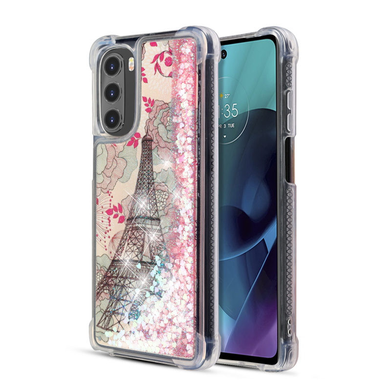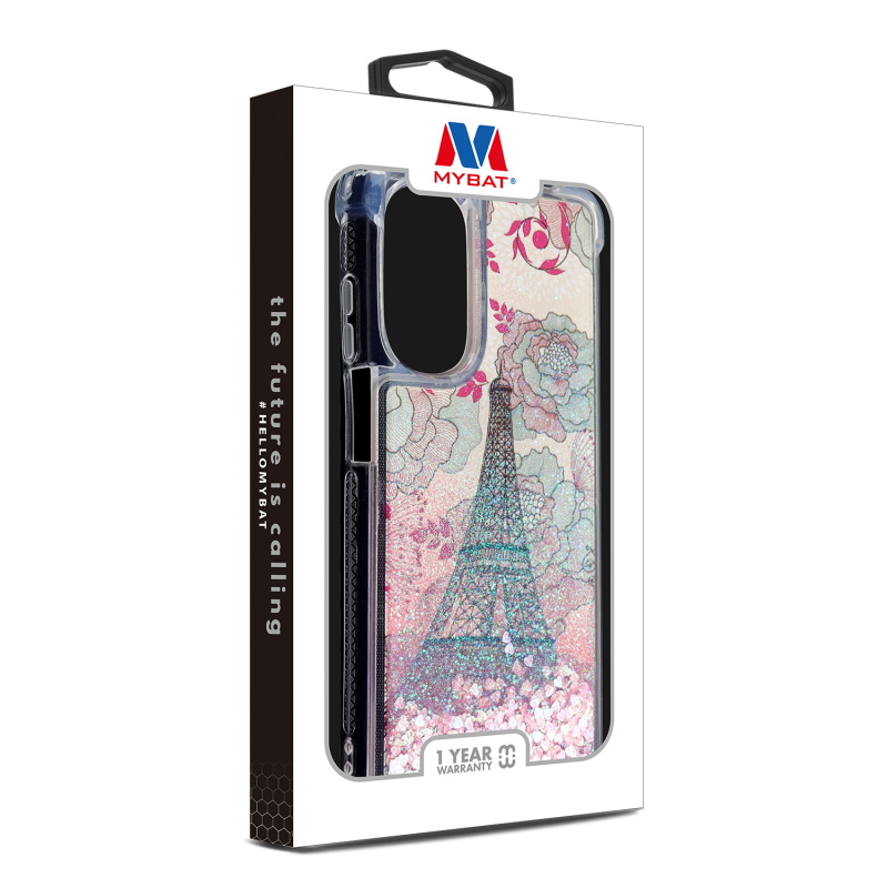 MyBat Quicksand Glitter Hybrid Protector Cover for Motorola Moto G Stylus 4G (2022) - Eiffel Tower & Pink Hearts