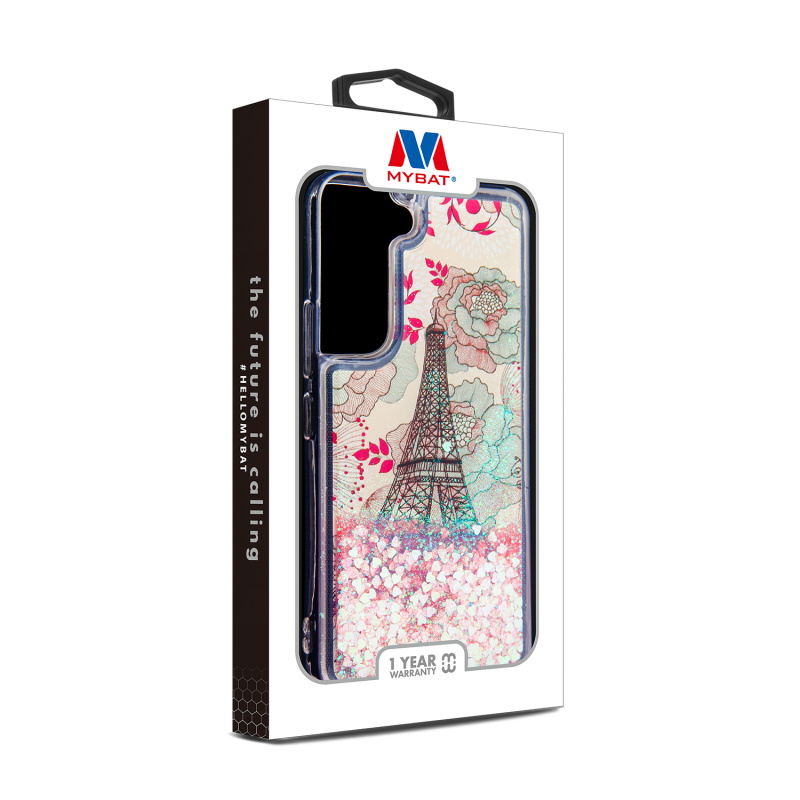 MyBat Quicksand Glitter Hybrid Protector Cover for Samsung Galaxy S22 - Eiffel Tower & Pink Hearts