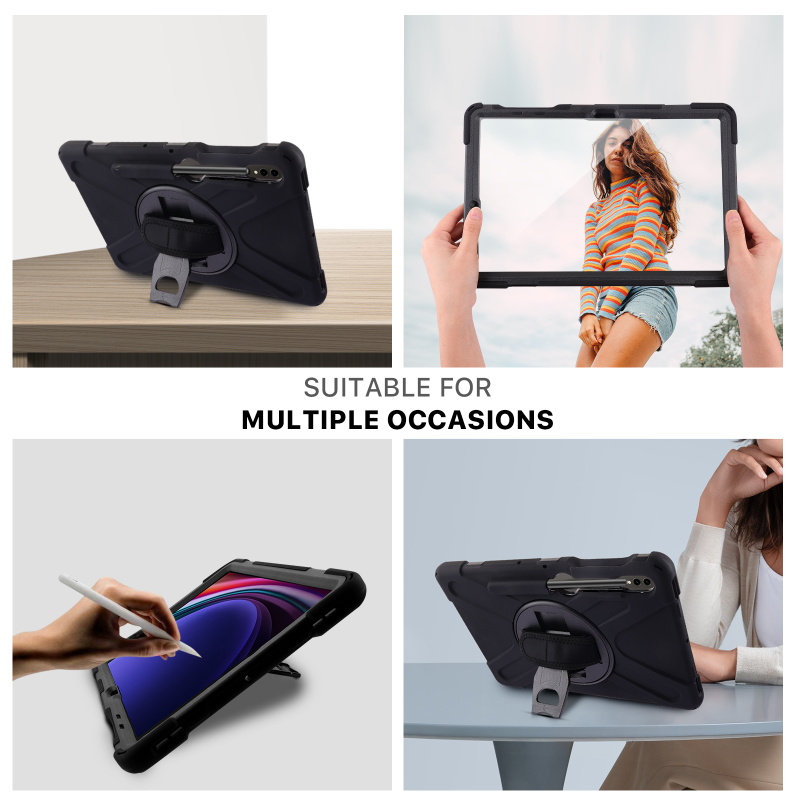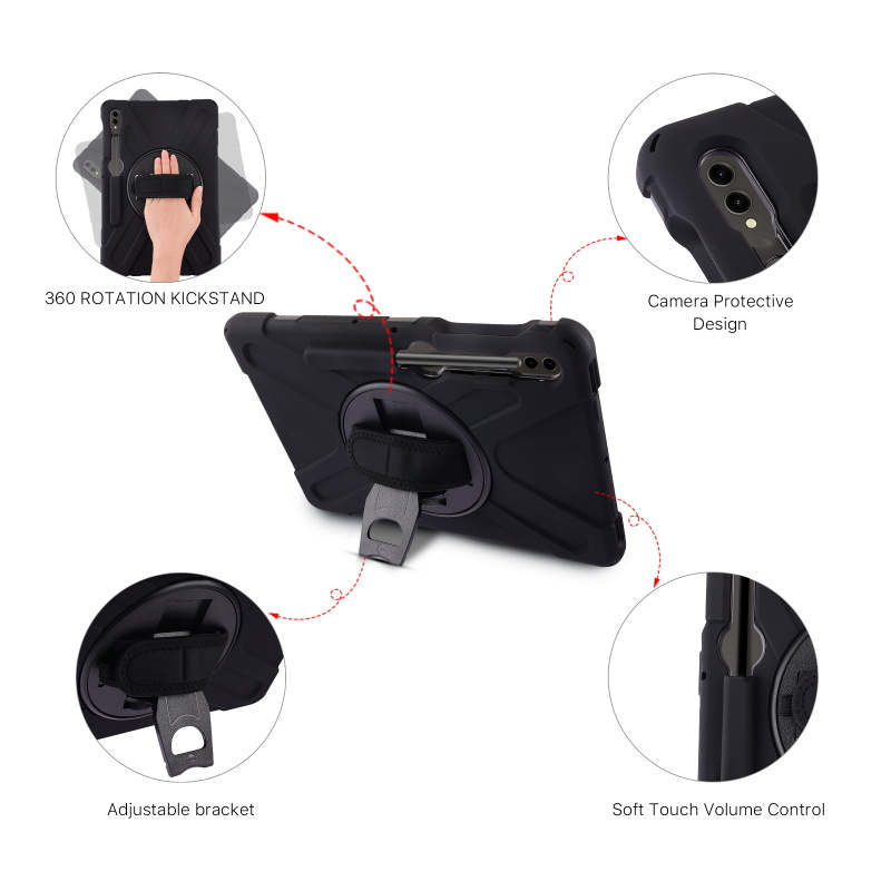 Heavy Duty Protection: Made of one layer premium shock-absorbing Silicone and two-layer hard PC; Provide protection against accidental drops, bumps, and shocks in daily use.360° Rotating Foldable Kickstand: Easy to open and close the stand; Provide multiple standing positions when viewing or typing.(Pen slot on the back of the case)360°Rotatable Adjustable Hand Strap: Adjustable length to adapt your hands, Easy to handle with one hand while lying down or get out.Shock &Drop Resistant: 4 Corners Shock Absorption & Anti-fall Protection.