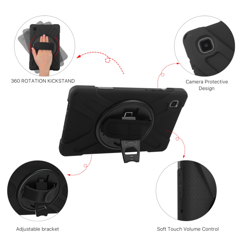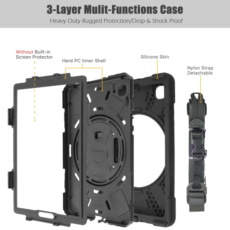 Heavy Duty Protection: Made of one layer premium shock-absorbing Silicone and two-layer hard PC; Provide protection against accidental drops, bumps, and shocks in daily use.360° Rotating Foldable Kickstand: Easy to open and close the stand; Provide multiple standing positions when viewing or typing.(Pen slot on the back of the case)360°Rotatable Adjustable Hand Strap: Adjustable length to adapt your hands, Easy to handle with one hand while lying down or get out.Shock &Drop Resistant: 4 Corners Shock Absorption & Anti-fall Protection.