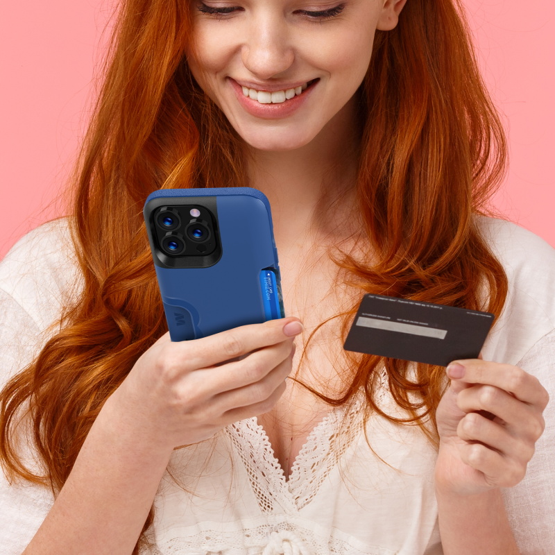 Holds up to 3 cards Shock absorbing TPU material Lightweight and durable protection Access to all buttons and ports Raised bezel lip to prevent damage on the front screen Non-slip grip