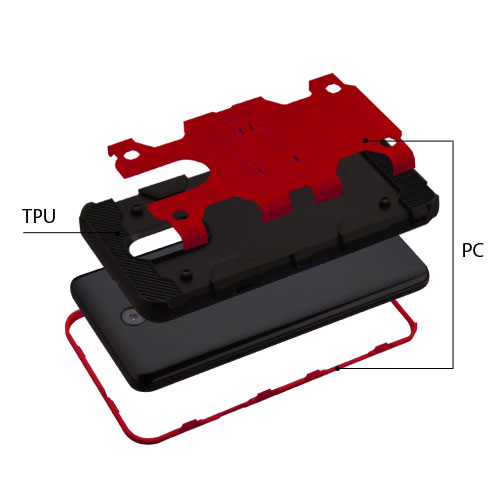 Inner TPU sleeve completely encases the device for excellent all-around impact protection Exterior PC hard shell shields the midsection from impact and doubles as a kickstand for easy landscape viewing Hexagon etched TPU interior promotes cooling and buffers against drops Unique metal-like exterior finish accents the case for a polished look Extended side grips provide better control of your phone Precise openings reserved for accessorizing with decorative charms and lanyards Meets military drop-test standard (MIL-STD 810G-516.6)