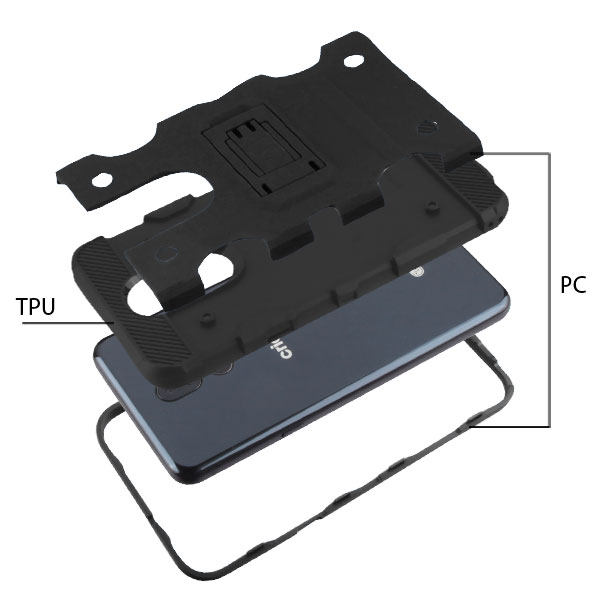 Inner TPU sleeve completely encases the device for excellent all-around impact protection Exterior PC hard shell shields the midsection from impact and doubles as a kickstand for easy landscape viewing Hexagon etched TPU interior promotes cooling and buffers against drops Unique metal-like exterior finish accents the case for a polished look Extended side grips provide better control of your phone Precise openings reserved for accessorizing with decorative charms and lanyards Meets military drop-test standard (MIL-STD 810G-516.6)