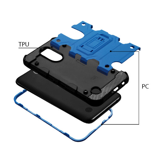 Inner TPU sleeve completely encases the device for excellent all-around impact protection Exterior PC hard shell shields the midsection from impact and doubles as a kickstand for easy landscape viewing Hexagon etched TPU interior promotes cooling and buffers against drops Unique metal-like exterior finish accents the case for a polished look Extended side grips provide better control of your phone Precise openings reserved for accessorizing with decorative charms and lanyards Meets military drop-test standard (MIL-STD 810G-516.6)