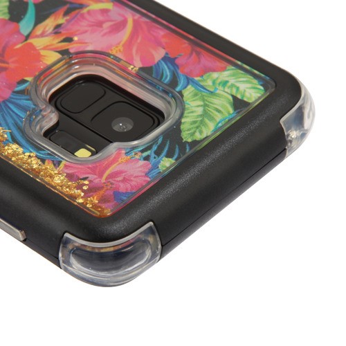 MyBat TUFF Quicksand Glitter Hybrid Protector Cover for Samsung Galaxy S9 - Natural Black / Electric Hibiscus & Gold Sparkles Liquid Flowing