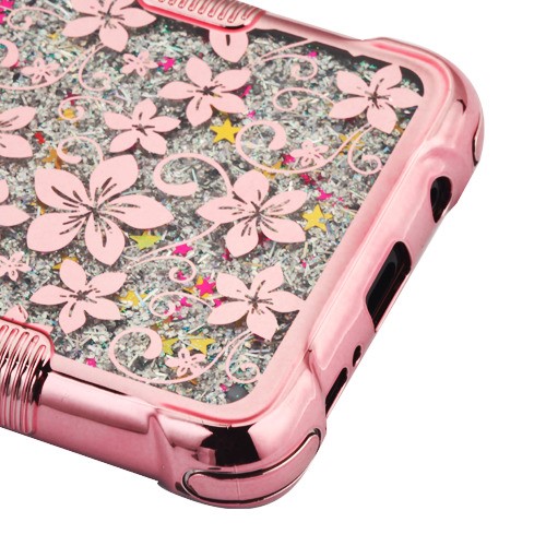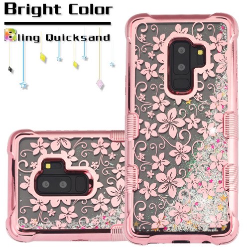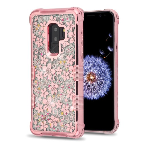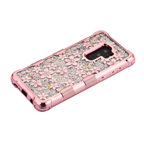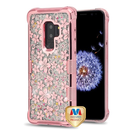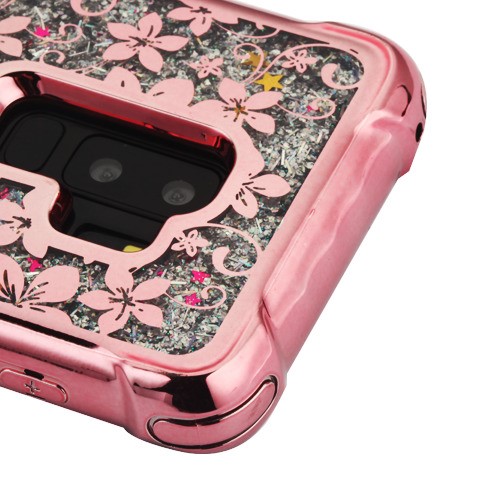 MyBat TUFF Quicksand Glitter Lite Hybrid Protector Cover for Samsung Galaxy S9 Plus - Rose Gold Electroplating / Hibiscus Flower / Silver Flowing Sparkles