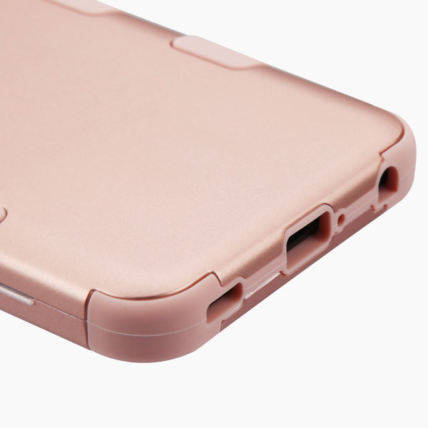 Patented hybrid case with textured metallic PC hard-shell and rubberized inner core Soft inner core absorbs shock and cushions the phone from drops and impact Raised front bezel elevates the phone’s screen to prevent tabletop scratches Extended padding protects the vulnerable corners and edges from impact Integrated kickstand easily props the phone to a comfortable viewing angle Meets military drop-test standard (MIL-STD 810G-516.6)