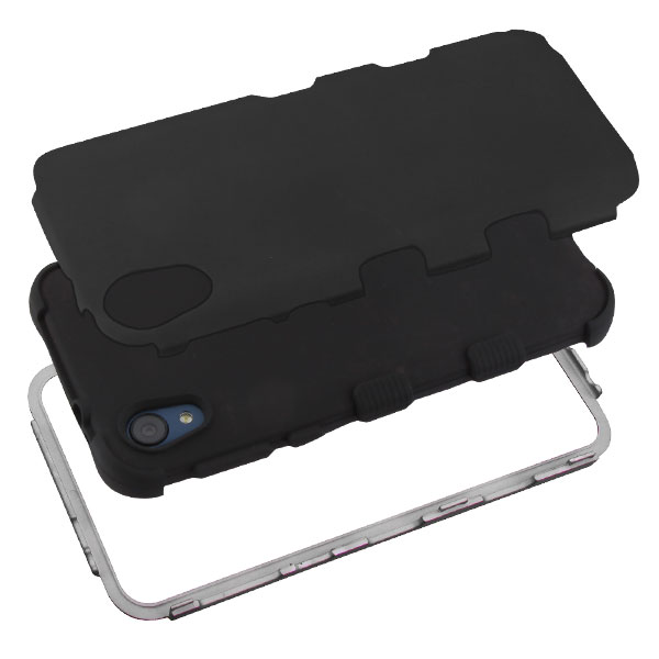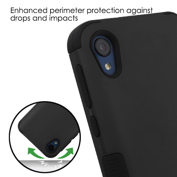 Patented hybrid case with textured metallic PC hard-shell and rubberized inner core Soft inner core absorbs shock and cushions the phone from drops and impact Raised front bezel elevates the phone’s screen to prevent tabletop scratches Extended padding protects the vulnerable corners and edges from impact Integrated kickstand easily props the phone to a comfortable viewing angle Meets military drop-test standard (MIL-STD 810G-516.6)