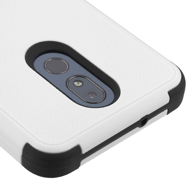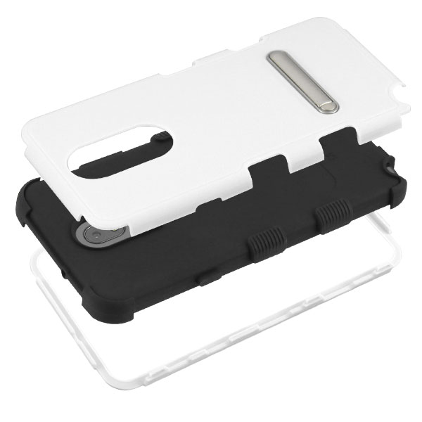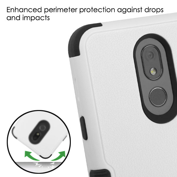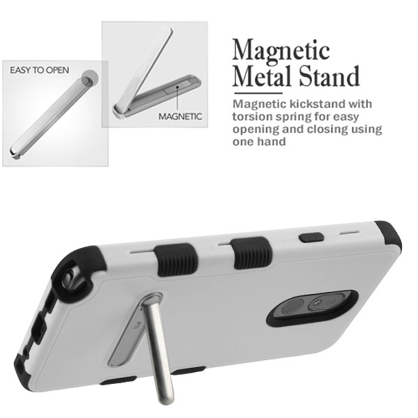 Rugged, two-piece hybrid design with rubberized inner core and polycarbonate hard-shell Magnetic kickstand with torsion spring for easy opening and closing using one hand Soft inner core absorbs shock and cushions the phone from drops and impact Raised front bezel elevates the phone’s screen to prevent tabletop scratches Extended padding protects the vulnerable corners and edges from impact Meets military drop-test standard (MIL-STD 810G-516.6)