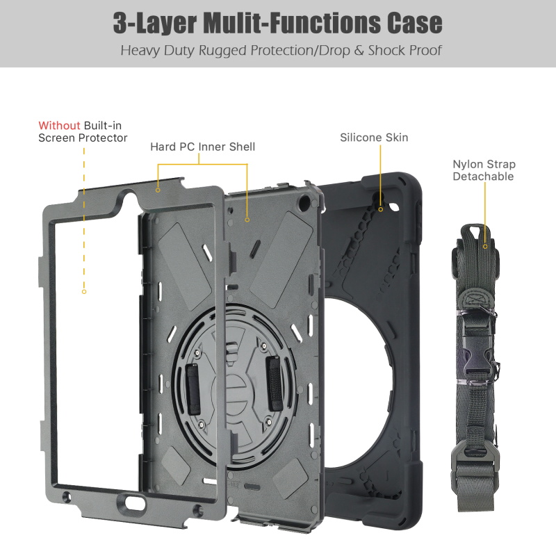 Provide your customers with a case that revolves around their iPad 10.2 (2021) and have them grab the black TurnTablet Xtra Grip Series Tablet Case from MyBat to go worry-free as they work, relax, and more! It is available in attractive packaging that makes it stand out on the shelf and shows off the product beautifully, making it an ideal addition to your inventory. The black TurnTablet Xtra Grip Series Tablet Case covers your customer’s iPad 10.2 (2021) with an innovative triple-layer design of a solid two-piece hard polycarbonate inner casing and a padded black silicone outer shell for 3X the durability of standard tablet cases. The case provides edge-to-edge coverage from accidental falls, drops, scratches, and more with raised bezel edges and rounded shock-absorbing corners. The 360° rotating hand-grip on the back provides seamless portability, easy carrying, and a secure view in either portrait or landscape. In addition to its hand grip, the black TurnTablet Xtra Grip features a collapsible kickstand that allows customers to watch shows, make video calls, type, and draw comfortably while on the go! Its ultra-slim, and lightweight design makes it easy to access the iPad 10.2 (2021)'s screen, buttons, and ports regardless of how it is held or viewed. As an added bonus, your customers will be able to travel with ease and keep their iPad 10.2 (2021) safe with the detachable nylon strap and buckles! For quick assembly and removal of the case, a handy pen tool is included to make it easier than ever! MyBat offers a limited one-year warranty for the TurnTablet Xtra Grip Series Tablet Case for iPad 10.2 (2021), ensuring the best quality, performance, and customer satisfaction. Features: Triple-Layered 2-Piece Solid Inner Case Padded Silicone Cover Raised Bezel Edges Rounded Shock-Absorbing Corners 360° Rotating Adjustable Hand-Grip Non-Slip Grip Collapsible Kickstand Easy Access: Ports & Buttons Quick Installation & Removal Detachable Nylon Carrying Strap Includes Tool/Pen For Disassembly 1-Year Warranty