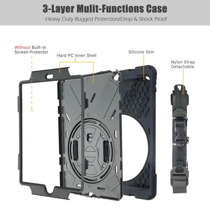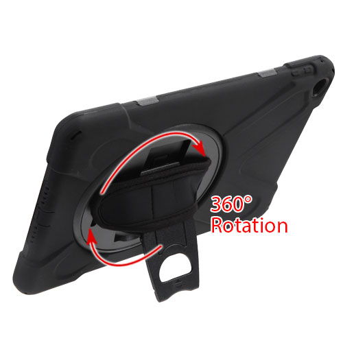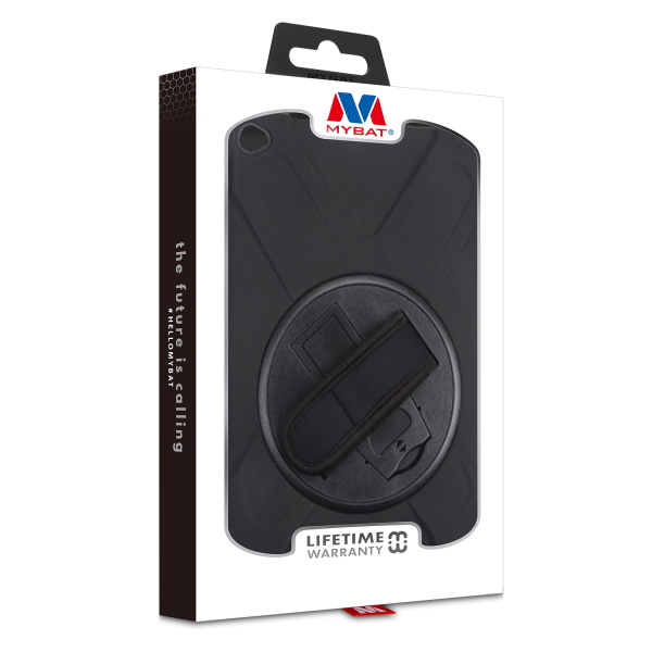 Provide your customers with a case that revolves around their iPad Air 2 and have them grab the black TurnTablet Xtra Grip Series Tablet Case from MyBat to go worry-free as they work, relax, and more! It is available in attractive packaging that makes it stand out on the shelf and shows off the product beautifully, making it an ideal addition to your inventory. The black TurnTablet Xtra Grip Series Tablet Case covers your customer’s iPad Air 2 with an innovative triple-layer design of a solid two-piece hard polycarbonate inner casing and a padded black silicone outer shell for 3X the durability of standard tablet cases. The case provides edge-to-edge coverage from accidental falls, drops, scratches, and more with raised bezel edges and rounded shock-absorbing corners. The 360° rotating hand-grip on the back provides seamless portability, easy carrying, and a secure view in either portrait or landscape. In addition to its hand grip, the black TurnTablet Xtra Grip features a collapsible kickstand that allows customers to watch shows, make video calls, type, and draw comfortably while on the go! Its ultra-slim, and lightweight design makes it easy to access the iPad Air 2's screen, buttons, and ports regardless of how it is held or viewed. As an added bonus, your customers will be able to travel with ease and keep their iPad Air 2 safe with the detachable nylon strap and buckles! For quick assembly and removal of the case, a handy pen tool is included to make it easier than ever! MyBat offers a limited one-year warranty for the TurnTablet Xtra Grip Series Tablet Case for iPad Air 2, ensuring the best quality, performance, and customer satisfaction. Features: Triple-Layered 2-Piece Solid Inner Case Padded Silicone Cover Raised Bezel Edges Rounded Shock-Absorbing Corners 360° Rotating Adjustable Hand-Grip Non-Slip Grip Collapsible Kickstand Easy Access: Ports & Buttons Quick Installation & Removal Detachable Nylon Carrying Strap Includes Tool/Pen For Disassembly 1-Year Warranty