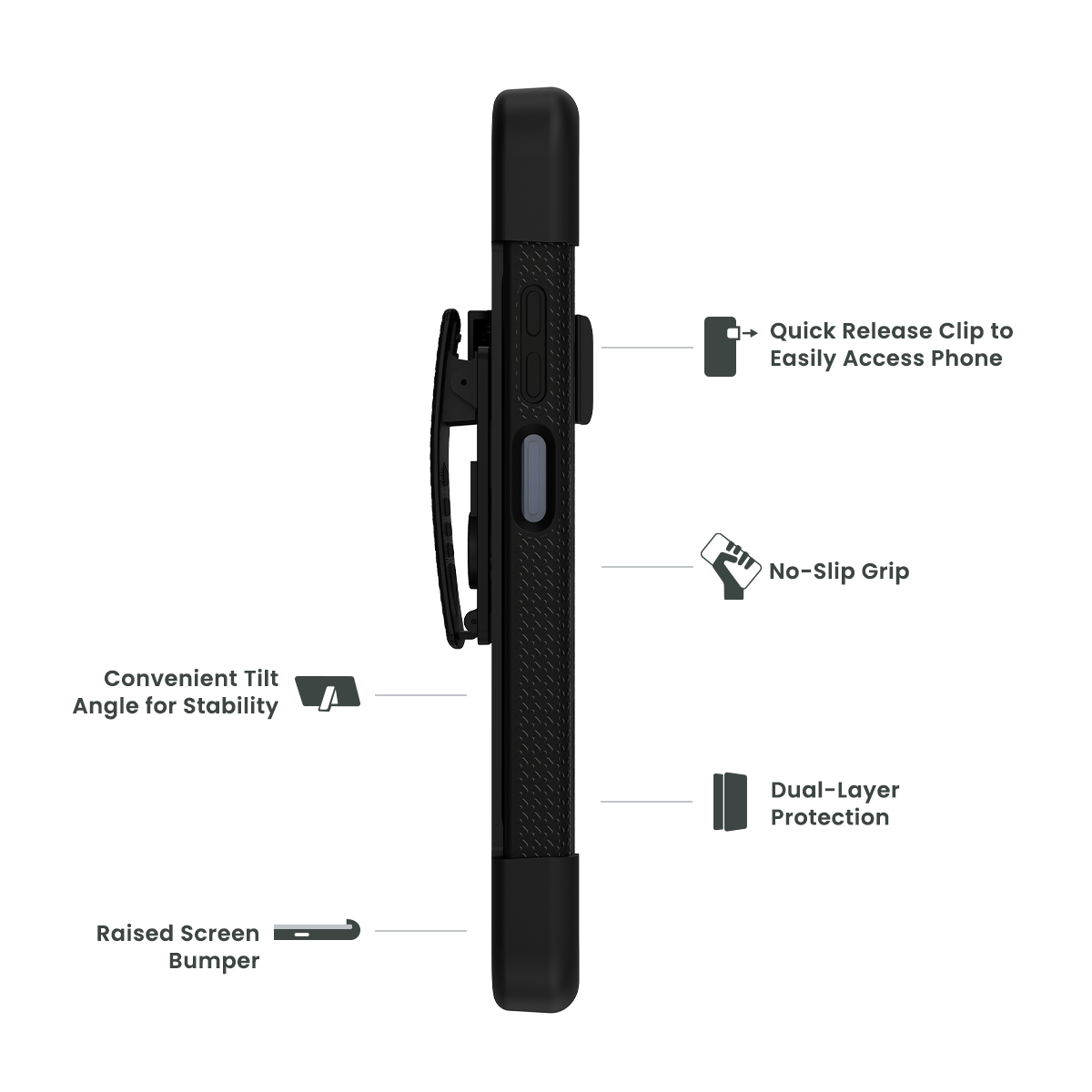 • Sturdy swivel holster clip for the ultimate on-the-go