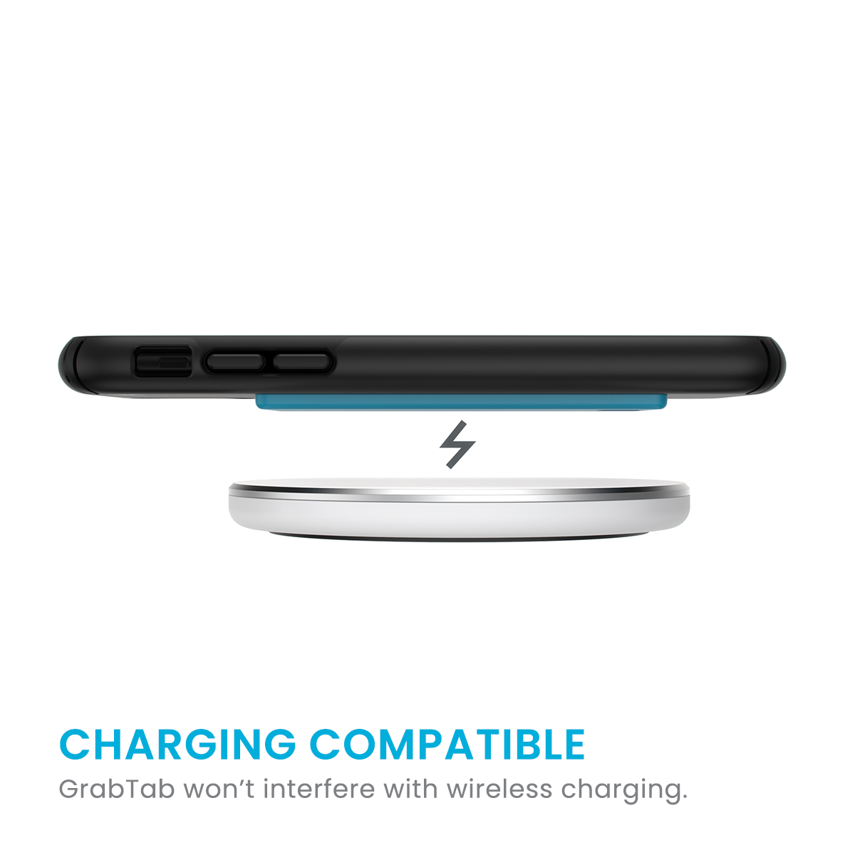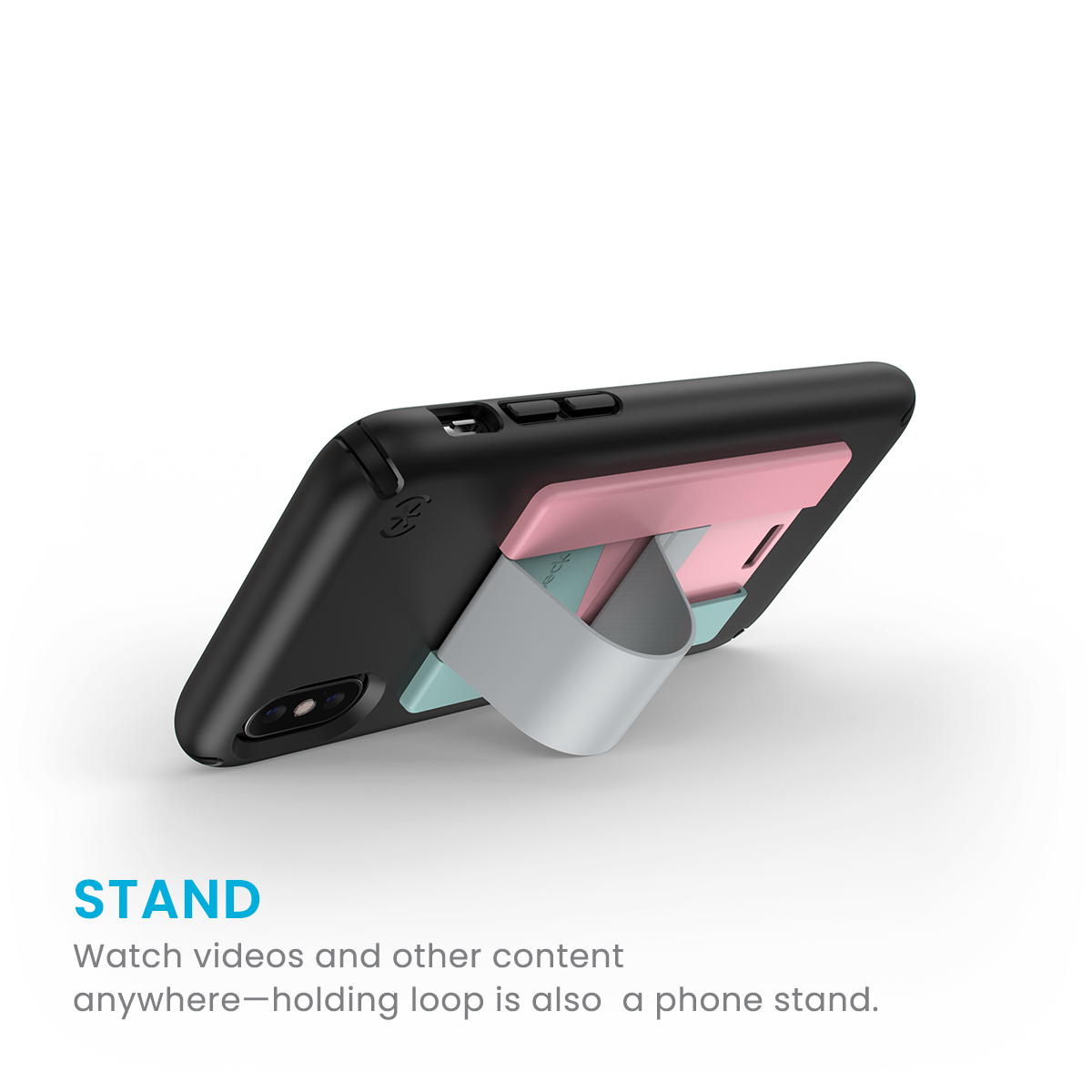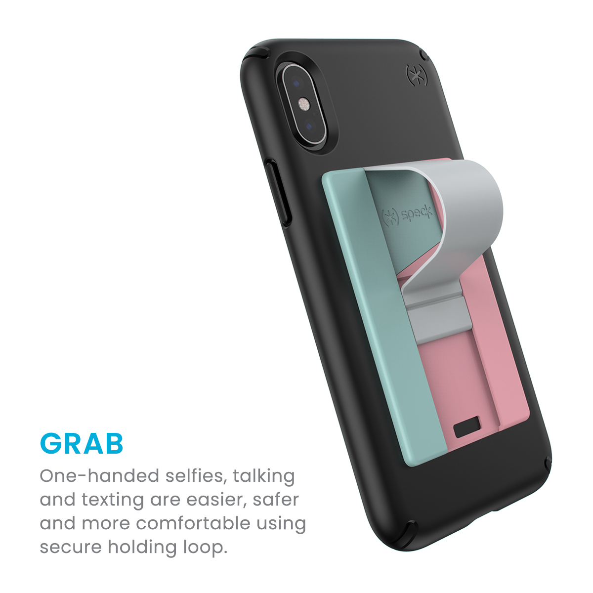 Grab 'n go. Flat, card-sized GrabTab attaches to the back of your phone and becomes a secure holding loop and a built-in phone stand — without adding bulk.