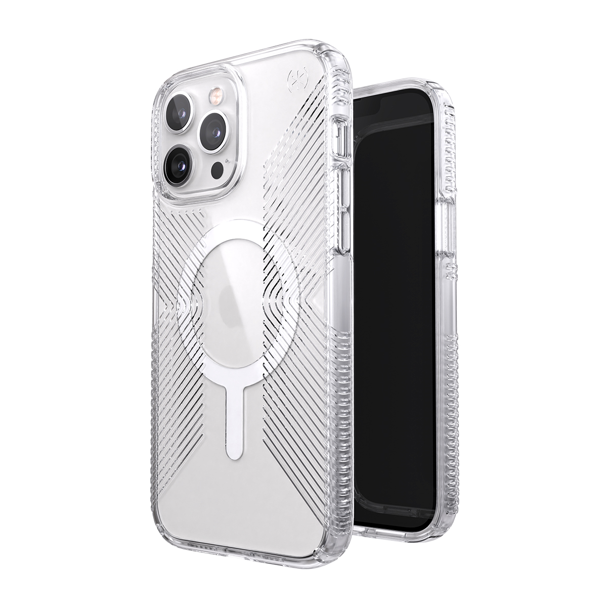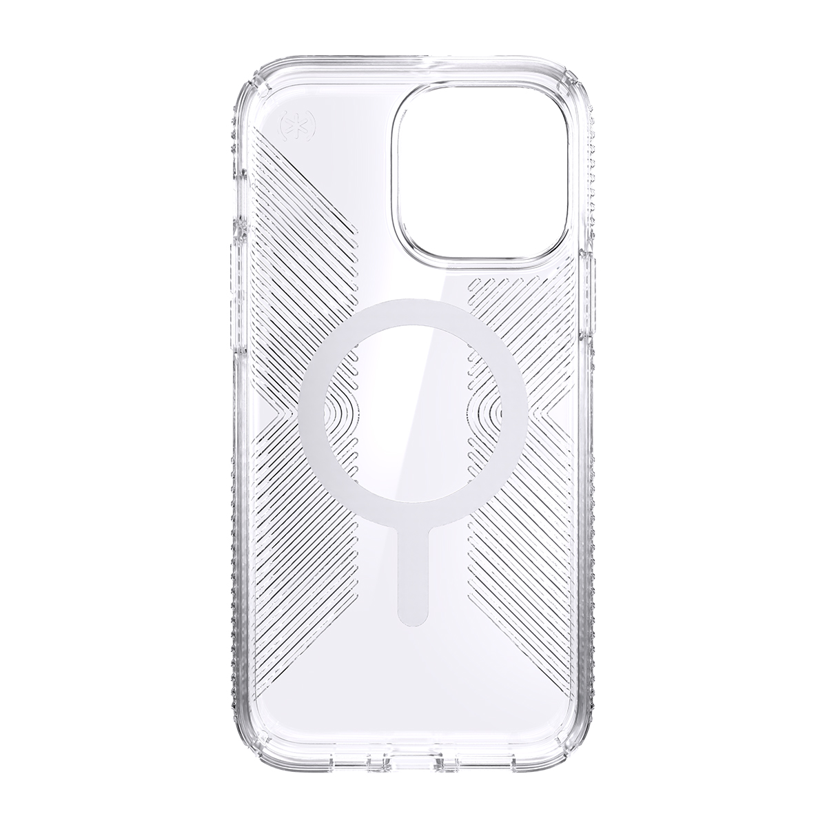 Clear package, strong grip. This case features innovative new materials that help it stay clear longer and provide more protection and durability. Features Speck's newly innovative no-slip inverted grips, offering great longevity, durability, and a strong grip, providing more confidence when texting, talking, or taking photos. Highly protective, yet slim, this durable case is designed with precise magnets that reliably work with all Apple MagSafe® accessories.