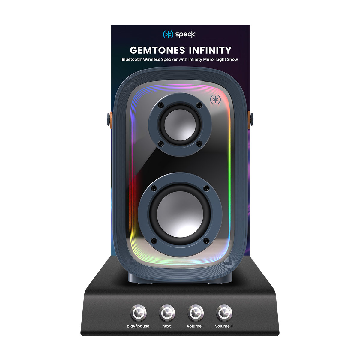 The Speck Gemtones Infinity POP Display with speaker creates an interactive and engaging shopping experience. This visually appealing display grabs attention and emphasizes the speaker's compact size and stunning aesthetic while providing key product information.
