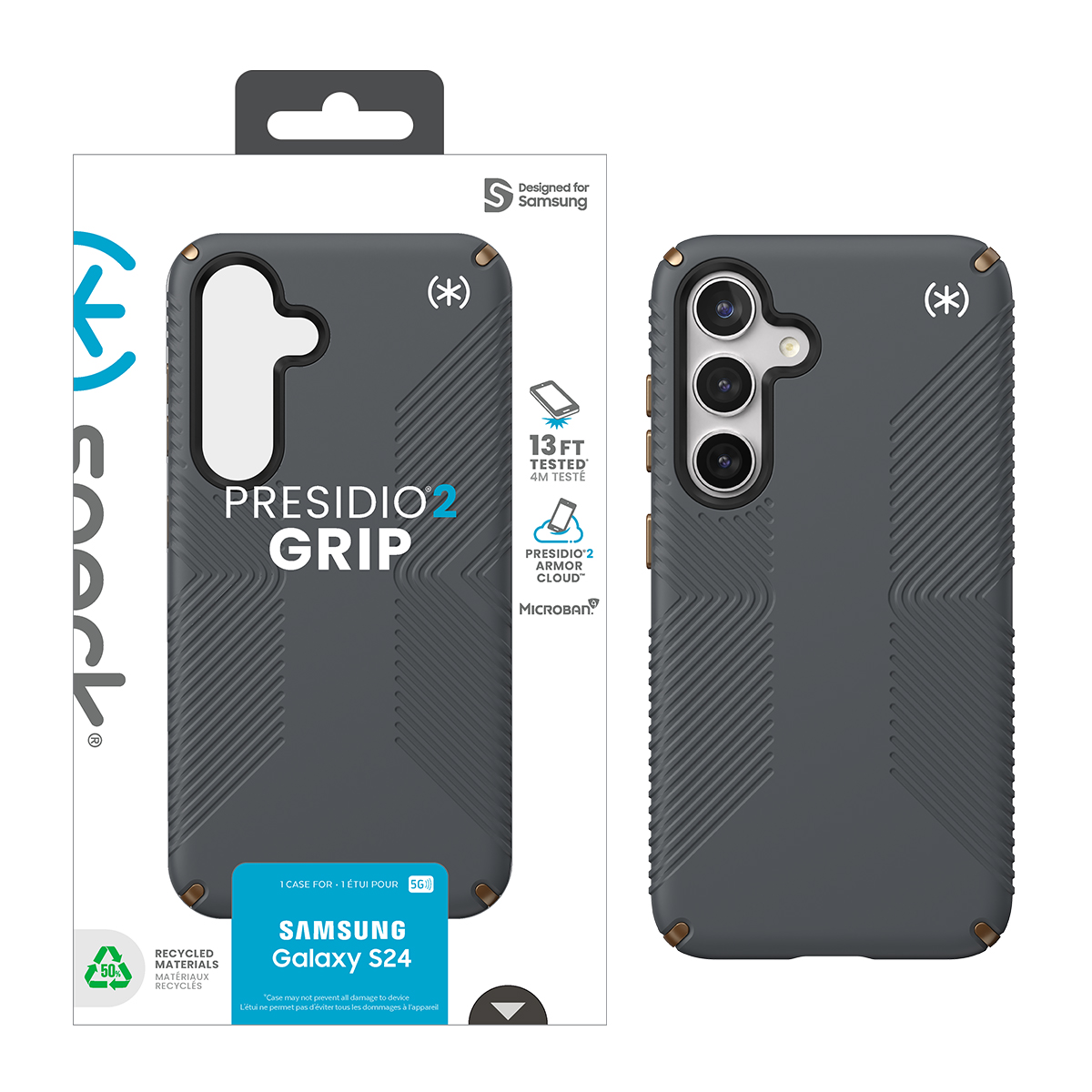 Get a grip on protection. The iconic Presidio2 Grip case with Presidio2 Armor Cloud™ Technology for 13 foot drop protection. Features innovative no-slip grips and Microban® antimicrobial protection.